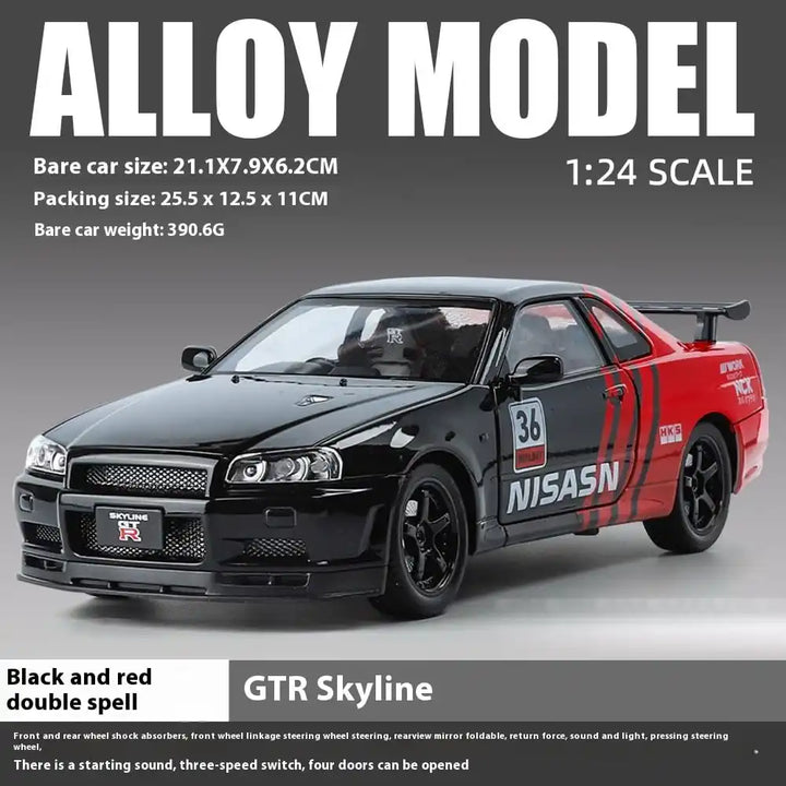 1:24 Nissan Skyline GT-R R34 Diecast Model Car – Black Edition with Lights & Sound, Pull-Back Action Collectible