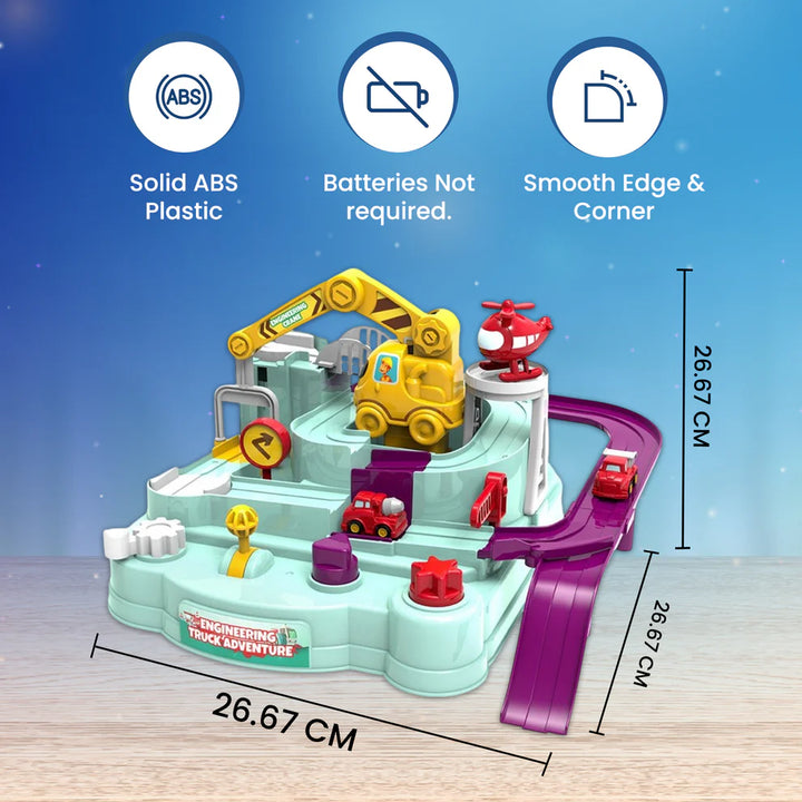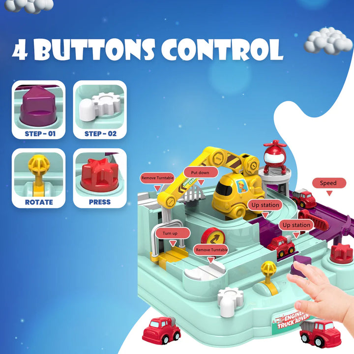 The Engineering Truck Adventure Track Toy uses levers and track inertia to make cars move β no batteries needed! Kids can guide two mini trucks through 7 exciting checkpoints using 4 interactive keys and a crane lift that raises the tracks.