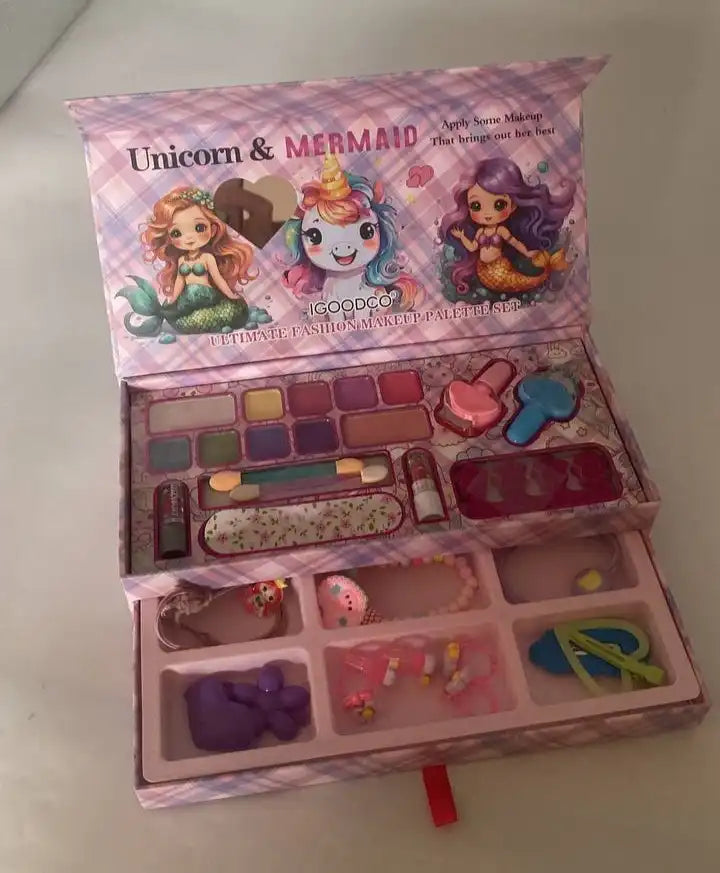 This charming makeup set features unicorn and mermaid-themed packaging, filled with washable, non-toxic cosmetics that let kids explore fashion and beauty safely. Perfect for pretend play, parties, or gifting, it encourages creativity and self-expression while ensuring safety and easy cleanup.