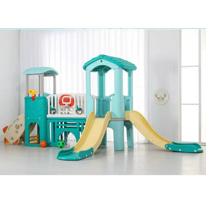 The Deluxe Kids Play Center (L-166" W-85" H-70") is the ultimate playset for children. Complete with slides, climbing sections, and interactive play, it offers hours of fun.