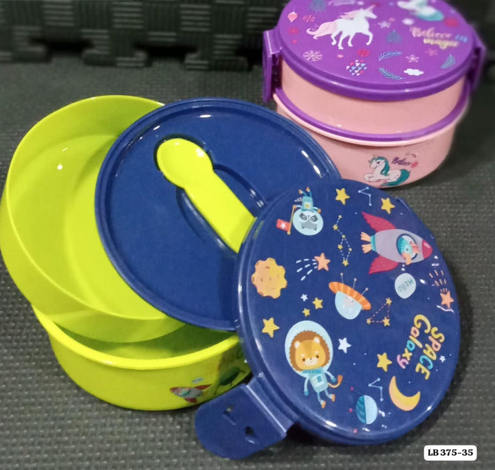 Two-tiered lunch box with cute designs—perfect for separating snacks and meals.